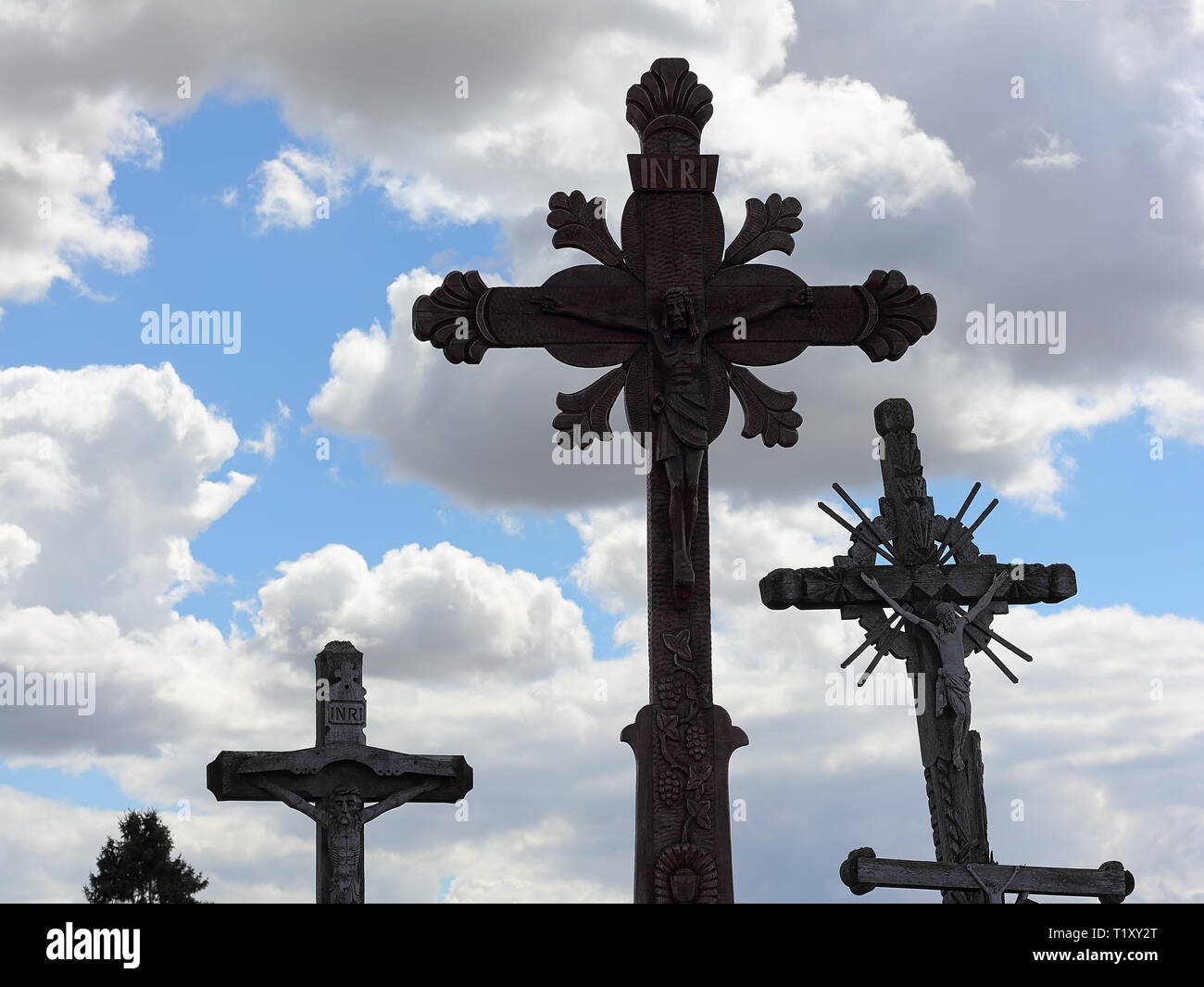 Get a 30.000 second three crosses on a hill. Three crosses on a hill. Visit of the three crosses hill. Plikasis kalnas), in kalnai park. Three crosses on a hill on a background.
